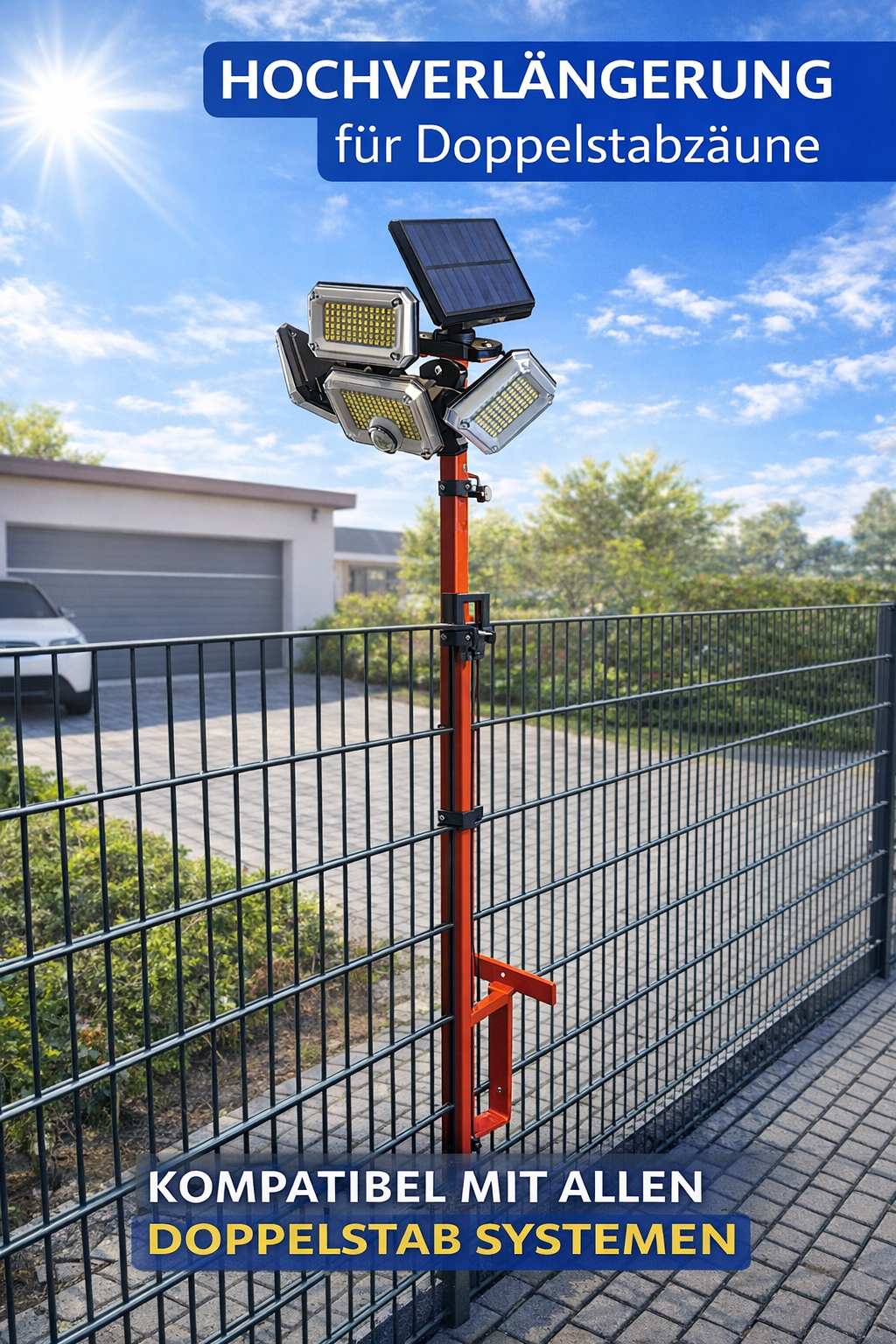 Einfach die Hochverlängerung an gewünschter Stelle im Doppelstabzaun einhängen, festschrauben und schon haben Sie Licht und das über lange Zeit. Die Montage dauert nur wenige Minuten. Das Solarmodul liefert ordentlich Power an die Strahler und Sie können somit auch größere Bereiche belichten. Dies dient Ihrer Sicherheit und auch Abschreckung. Natürlich können Sie auch z.B. Überwachungskameras, Rumdumleuchten, Windfahne und vieles mehr an der Hochverlängerung befestigen.Optional bieten wir hier die fertig montierte Halterung inkl. LED Solarstrahler mit an.