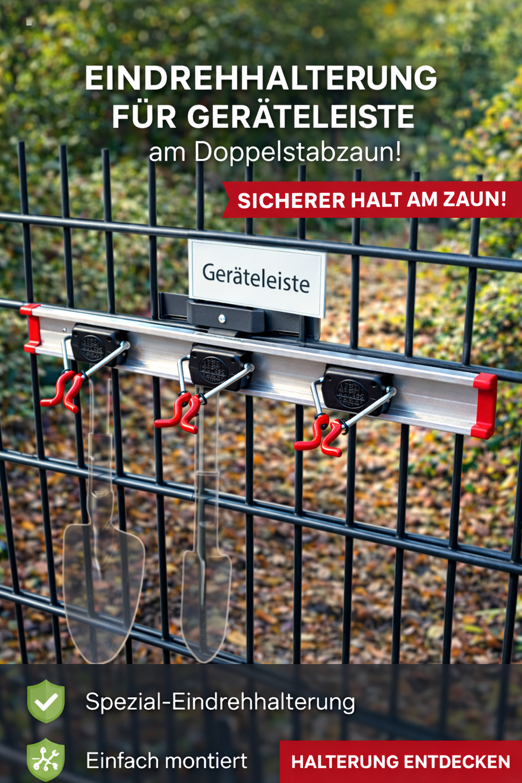 Startseite » EINDREHHALTERUNGEN FÜR ZAUN-BEFESTIGUNGEN » Eindrehhalterung HAUS u. GARTEN » GERÄTELEISTE EINDREHHALTERUNG