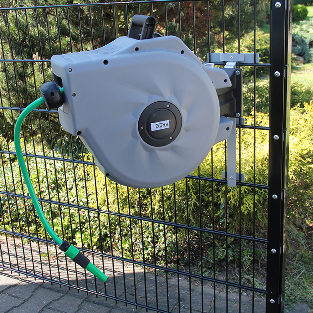Die Halterung kann variabel für die Nutzung montiert werden. Idealerweise im Bereich des Zaunpfostens für die tägliche Nutzung im Garten, oder auch zur Überbrückung längerer Strecken zwecks Bewässerung.