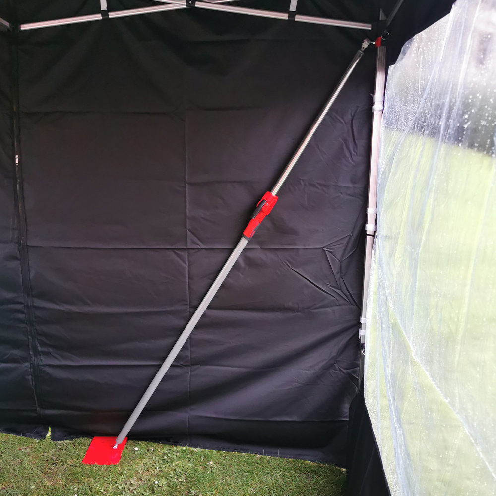 Die Montagestütze verfügt über schwenkbare Gelenke, welche sich jeder Situation am Einsatzort anpaßt. Die Ankerplatte mit Ihrem Zahn erlaubt sicheres ansetzen der Stütze. Der Zahn vergräbt sich praktisch ins Erdreich oder auch in die Fugen zwischen Pflastersteinen.