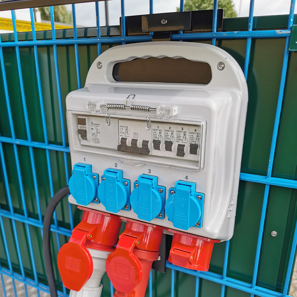 - Der Stromverteiler verfügt über 2 x CEE400V-16A; 1 x CEE400V-32A Anschlüsse sowie für 4 Stück Standart 230V Schukosteckdosen
