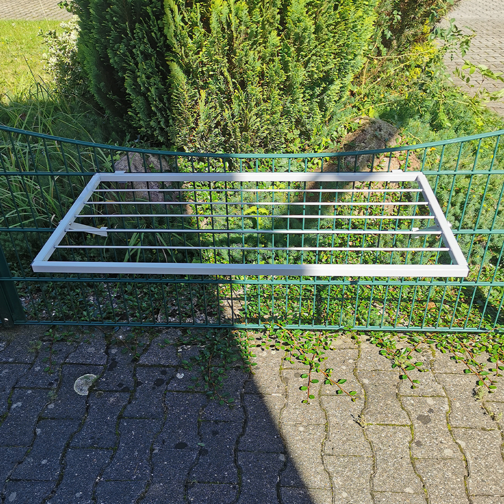 Wir liefern jedes Wäschebord in den gängigen Zaunfarben RAL 7016 ( Anthrazit ), RAL 6005 ( Moosgrün ), RAL 9006 ( silber - verzinkt ), Edelstahl oder individuell lackiert ( Wunschfarbe nach RAL RAL KARTE ), inkl Schraubsicherung. ( Optional bei Bedarf verwendbar ). Das Wäschebord kann flexibel an jedem Zaunfeld montiert werden und verbleibt dort ganzjährig. Sie brauchen es nicht bei Sturm oder zu Winterzeiten demontieren oder abnehmen.