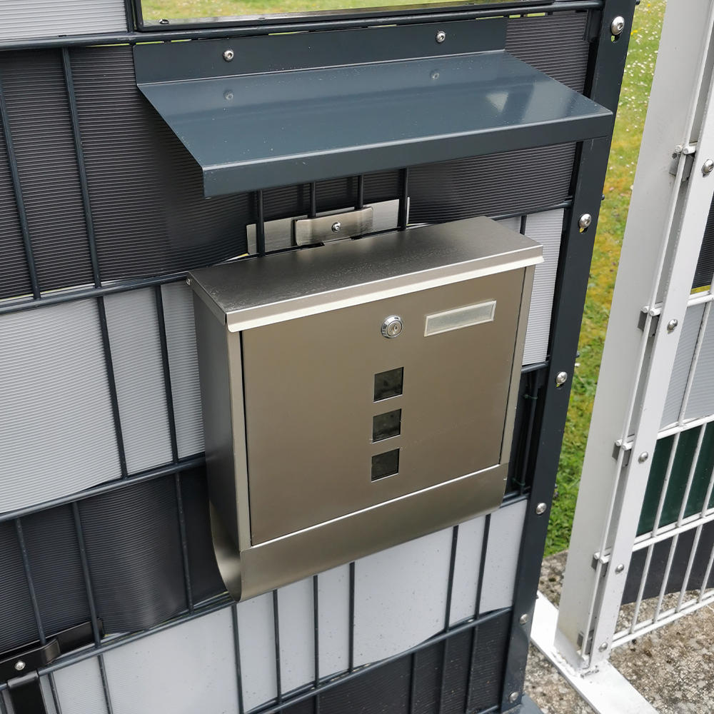 Die Halterung kann mit allen marktüblichen Briefkästen verschraubt werden. Eventuell müssen SIe die Schrauben in Ihren Briefkasten auf die Halterung anpassen bzw. Bohren.